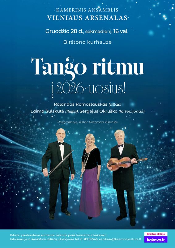 „Man tango visuomet buvo skirtas ausims, o ne kojoms“, – šiuos žodžius pasakęs argentiniečių kompozitorius Astor Piazzolla, vargu ar tikėjosi, kad jo muzika taps tokia populiaria, jog net ir prabėgus daugeliui metų po kūrėjo mirties, tango skamba visur – nuo koncertų salių, iki televizinių reklamų ar filmų. Tradicinis šokis su klasikinės muzikos, džiazo ar netgi roko elementais, viskas nuspalvinta nenusakomu ilgesiu, nostalgija ir aistra. Tai ne tik šokių muzika. Á. Piazzollos kūriniai skirti klausytis ir drauge pasinerti į emocijų kupiną tango istoriją. Gaivališkos, melodramatiškos, tačiau kartu ir aistringai nostalgiškos kompozicijos kvies klausytis ir drauge praleisti paskutines metų akimirkas. Autentiškoje Birštono kurhauzo erdvėje ansamblis „Vilniaus arsenalas“ atliks pluoštą Argentinos kompozitoriaus tango, kurie sukurs nepaprastą vakaro atmosferą.