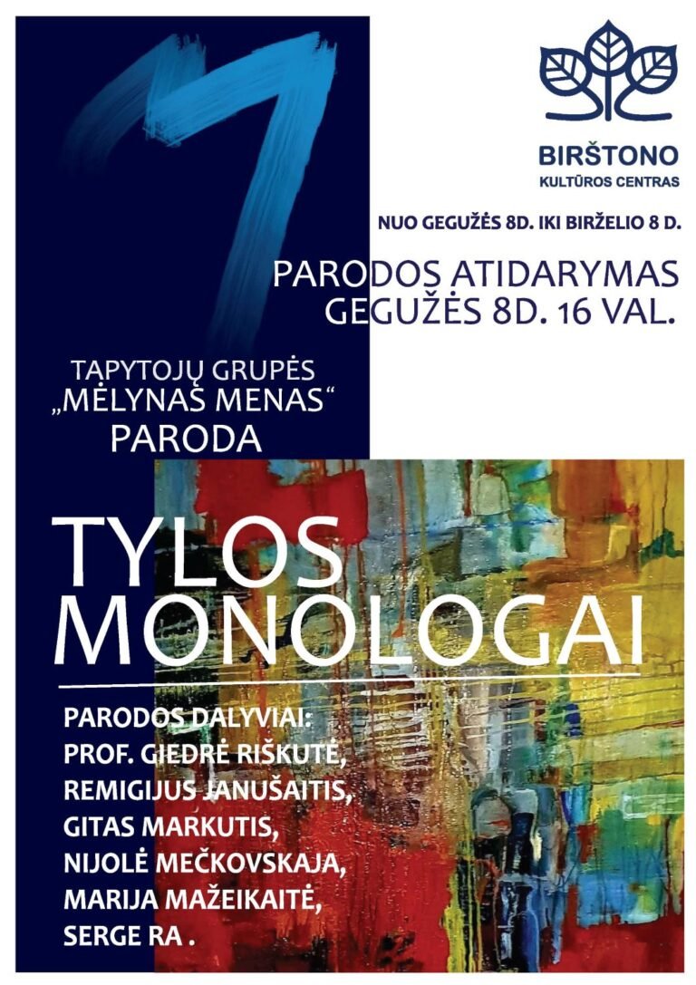 Paroda „Tylos monologai” Nuo gegužės 8 d.iki birželio 8 d.Birštono kultūros centre Tapybos parodaTYLOS MONOLOGAI Atidarymas – gegužės 8 d. 16 val. PARODOS DALYVIAI:Prof. Giedrė RiškutėRemigijus JanušaitisGitas MarkutisNijolė MečkovskajaMarija MažeikaitėSerge Ra FacebookLinkedin