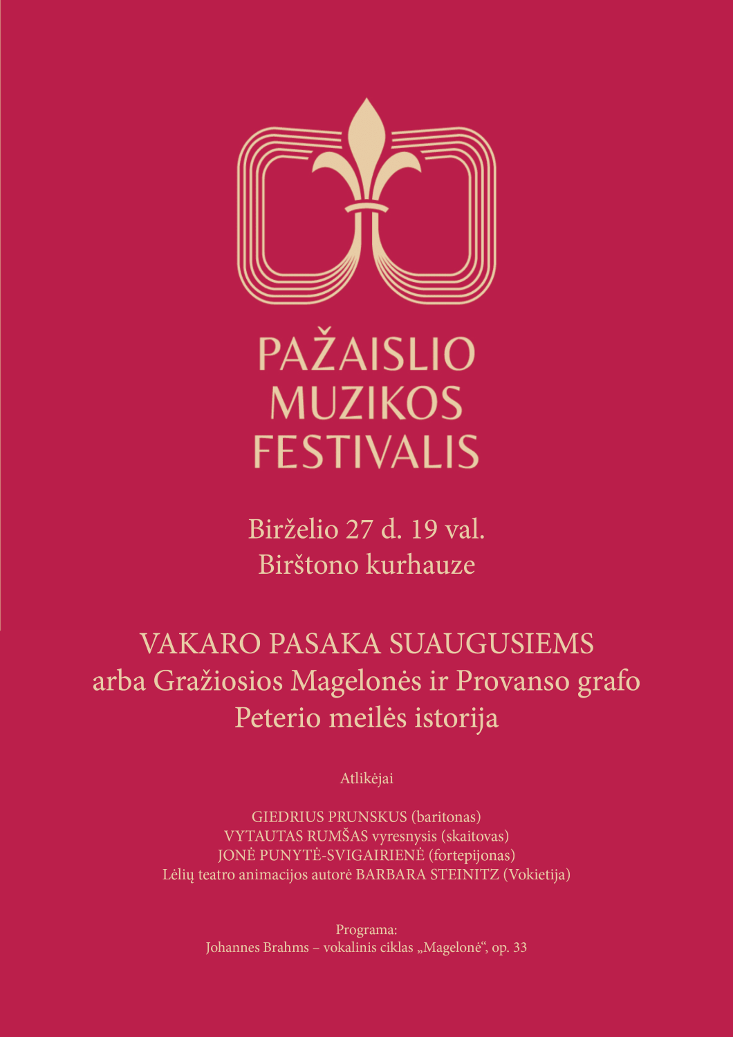 Birželio 27 d. Birštono kurhauze Pažaislio muzikos festivalis kviečia klausytojus pasiklausyti vakaro pasakos suaugusiems – skambės Lietuvoje retai girdimas Johanneso Brahmso vokalinis ciklas „Magelonė“, op. 33, paremtas viduramžiška riterių pasaka! Gyvybę kūriniui įpūs tarptautinė keturių talentingų atlikėjų komanda – baritonas Giedrius Prunskus, pianistė Jonė Punytė-Svigarienė, skaitovas Vytautas Rumšas vyresnysis ir iliustracijų autorė Barbara Steinitz.